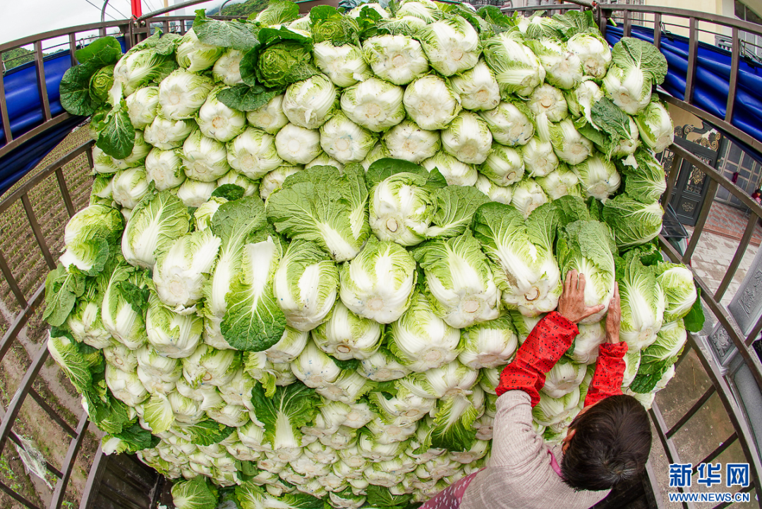 4月8日,农户将大白菜整齐堆放在车上。新华网肖和勇摄