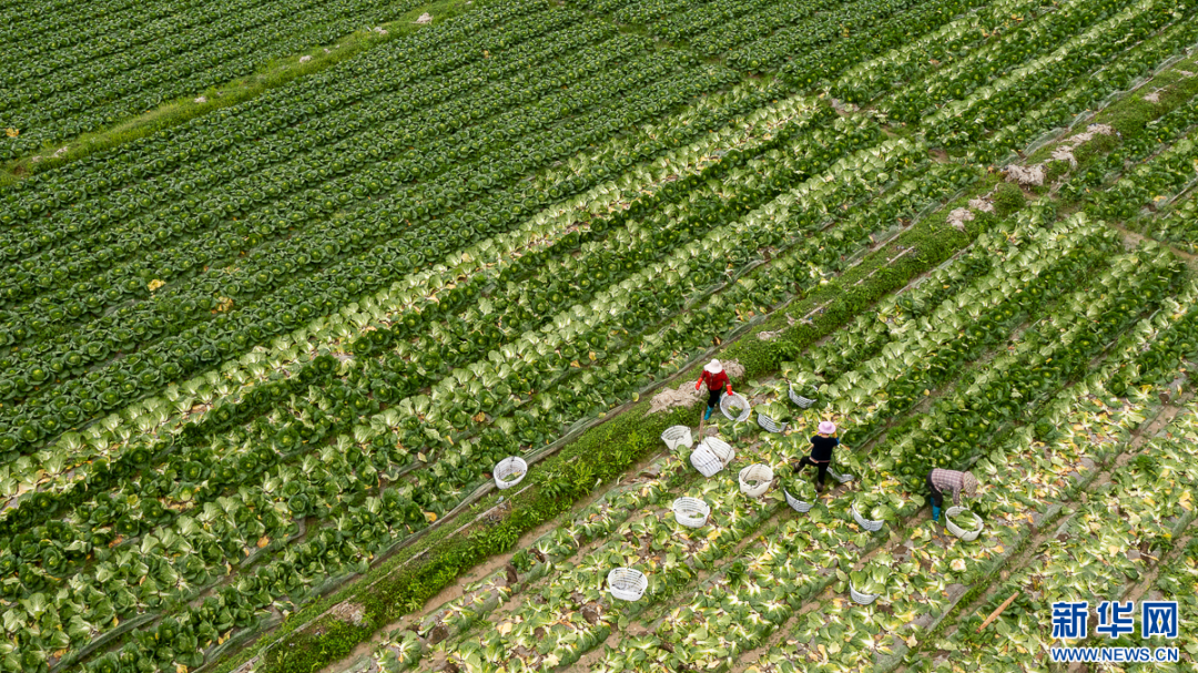4月8日,农户将大白菜挑出田间(无人机照片)。新华网肖和勇摄