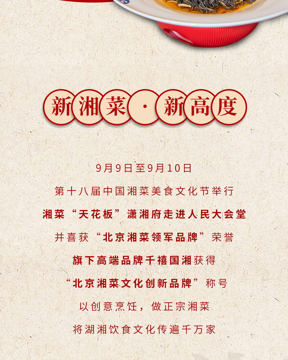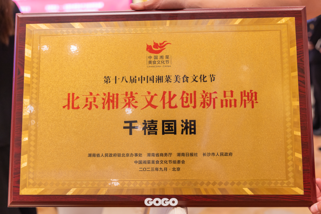 其高端创新品牌千禧国湘获得“北京湘菜文化创新品牌”荣誉,双奖齐发,为今后的湘菜之路奠定更深根基,为其发展之途添上浓墨重彩的一笔。