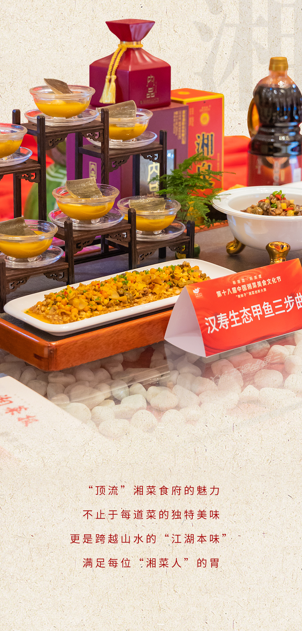 随着比赛激烈进行,一旁菜品展示区已然是“湘菜”云集,每一道菜系别具风味,向现场专家评审展示其独具匠心之处,品味舌尖上的鲜辣湘味。