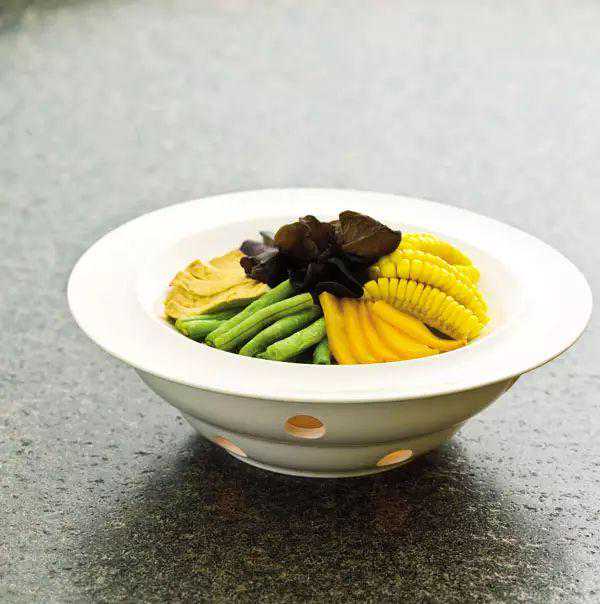 3.将豆角、紫茄子、老豆腐、南瓜、玉米,分别切成宽1.5厘米、长6厘米的段,放入烧至六成热的油温中炸至断生,再拼装成圆形放入盘中;水发木耳去根,盖于原料的上面,上笼蒸8分钟,浇入A料即可。