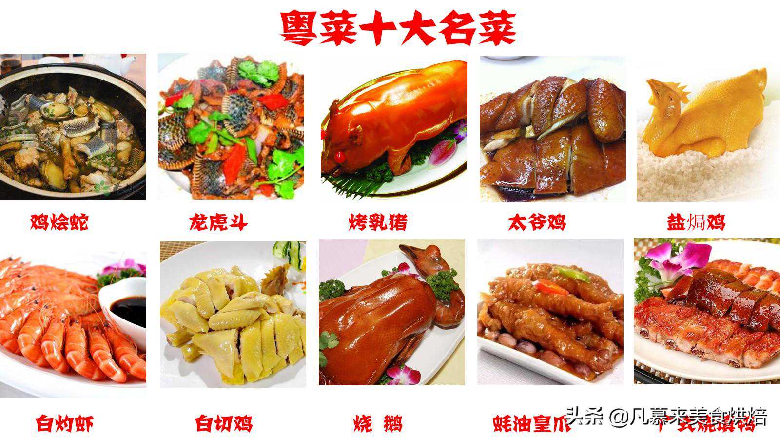 3.粤菜十大名菜:鸡烩蛇、龙虎斗、烤乳猪、太爷鸡、盐焗鸡、白灼虾、白切鸡、烧鹅、蚝皇凤爪、广式烧填鸭。