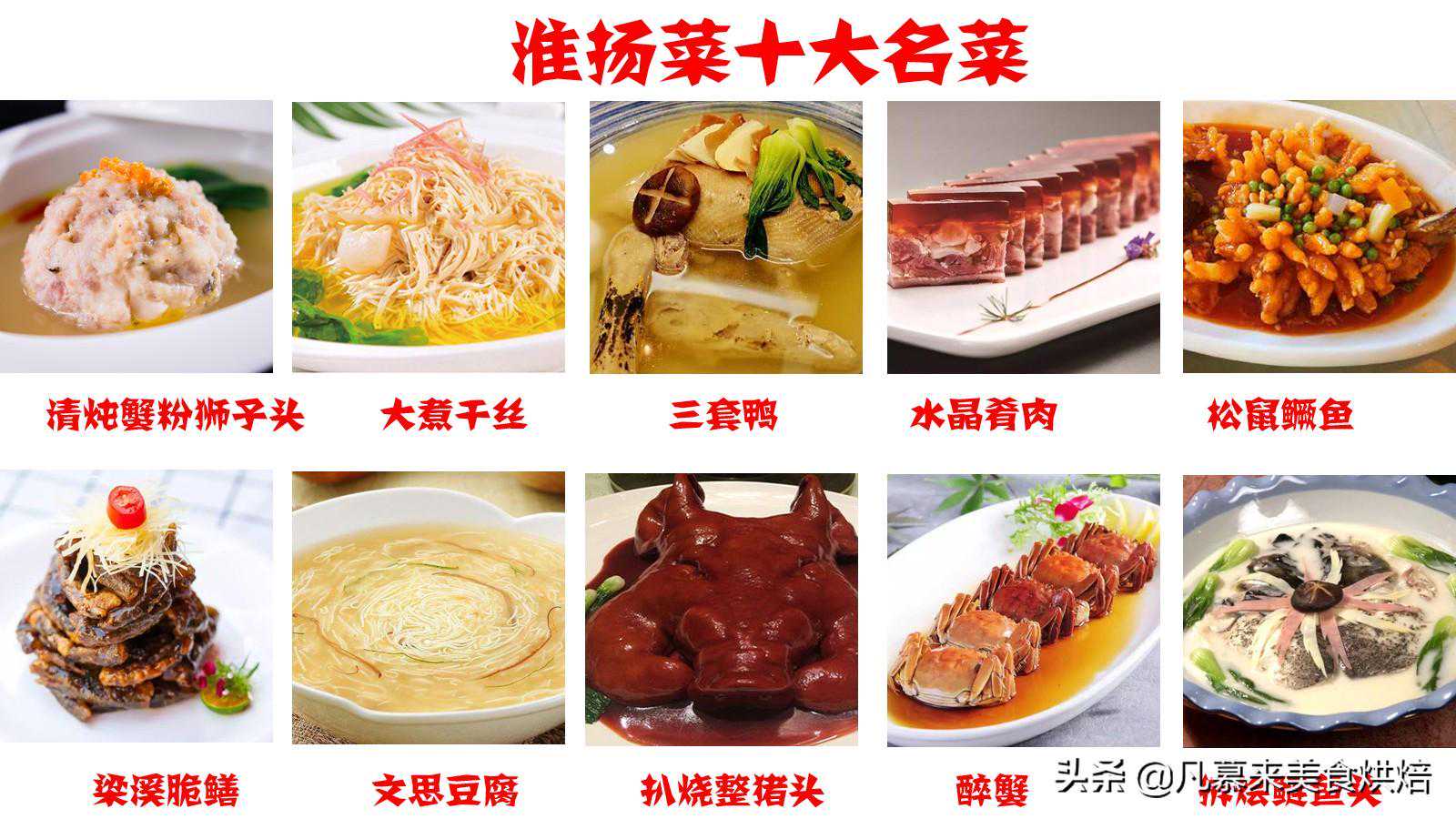3.淮扬菜十大名菜:清炖蟹粉狮子头、大煮干丝、三套鸭、水晶肴肉、松鼠鳜鱼、梁溪脆鳝、文思豆腐、扒烧整猪头、醉蟹、拆烩鲢鱼头。