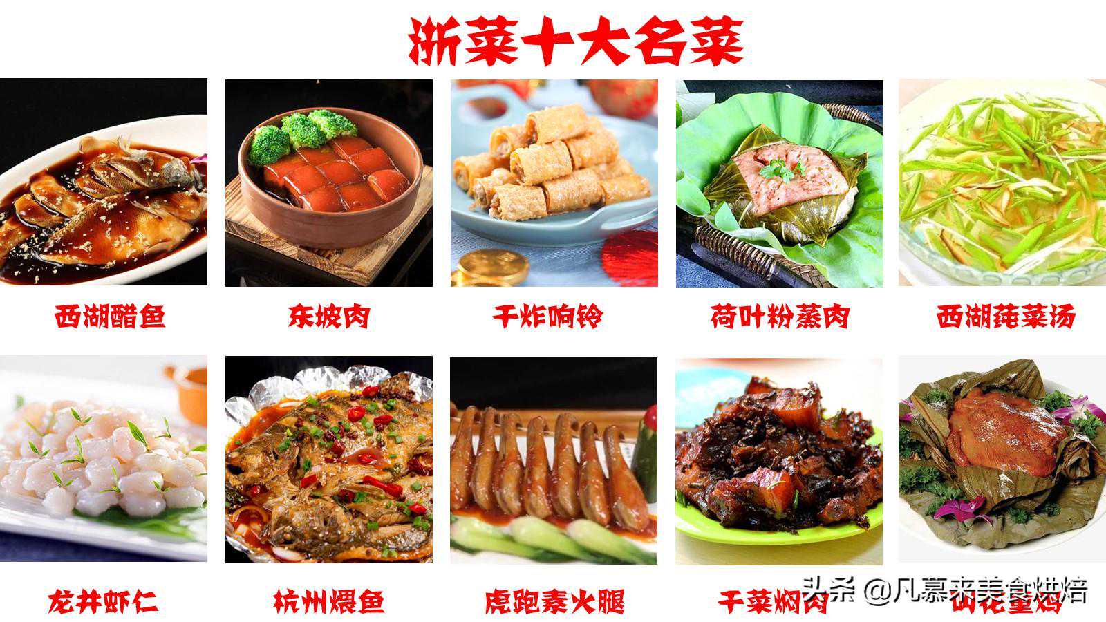 3.浙菜十大名菜:西湖醋鱼、东坡肉、干炸响铃、荷叶粉蒸肉、西湖莼菜汤、龙井虾仁、杭州煨鱼、虎跑素火腿、干菜焖肉、叫花童鸡。