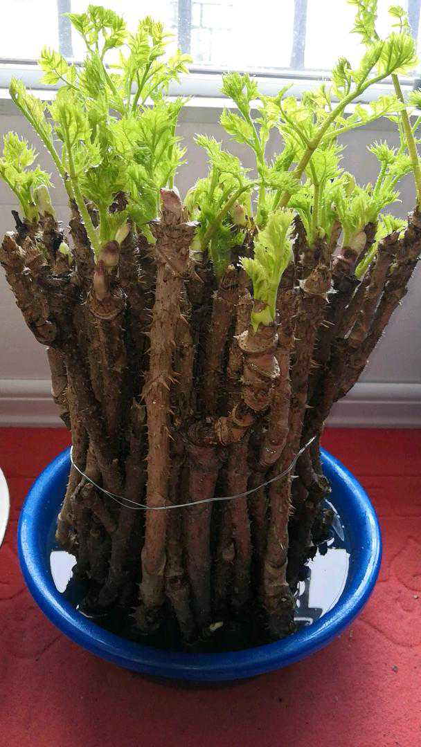 到了冬天的时候,他们就会在室内准备好一个大水槽,放上大约10厘米深度的水,并将嫩枝以竖立的方式放入水槽中,使芽尖向上,开始在室内水培刺老芽。