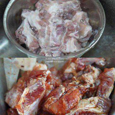 1、排骨冲洗干净,浸泡出血水,泡上几个小时是必须滴~排骨泡好了,沥干水,加入生抽料酒姜片抓匀。