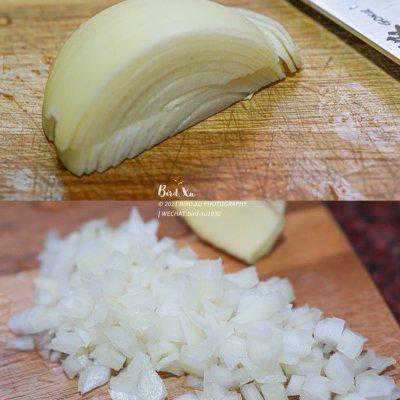 3、把洋葱切碎,白的紫的洋葱都可以。