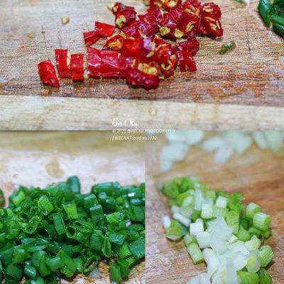 4、辣椒,小葱,切碎备用。葱白和葱绿最好分开来~