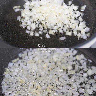 5、锅里加入金龙鱼橄榄调和油,它的燃烧烟点高,很适合温度高的中式烹饪。把洋葱末煎炸得变透明。