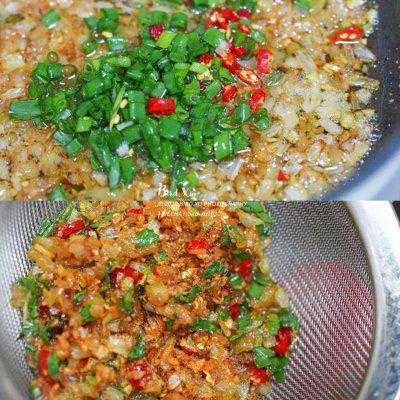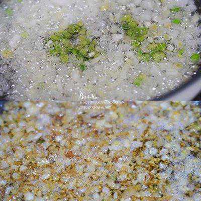 6、继续加入葱白,和蒜末,煎炸至金黄。