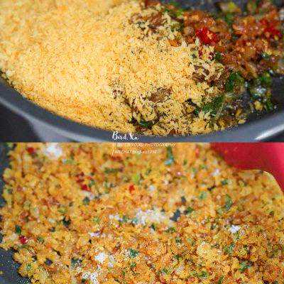 8、下面包糠(面包糠选黄色的成品会更好看)翻炒一番,加点糖和盐调个味,炒好乘出备用。面包糠比较吸油,所以上一步最好把多余的油滤出。