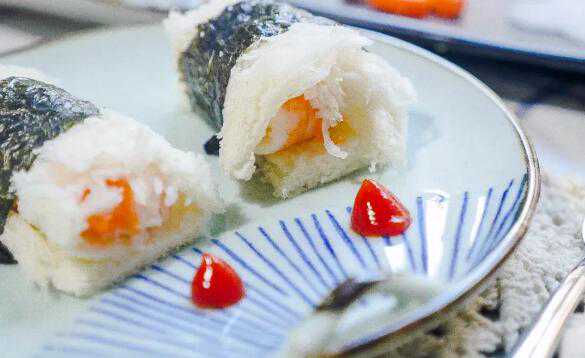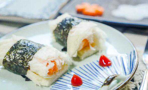 有时候赶上起床晚了没时间给小思同学做早餐,就赶快把家里常备的自制吐司面包拿出来,然后准备点富含蛋白质的虾肉,以及补充维生素、矿物质的胡萝卜丝,加上香脆的海苔,就包裹成了一个小“饭团”。