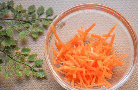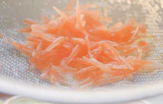 5.焯好的胡萝卜丝捞出沥干,放入碗中备用。