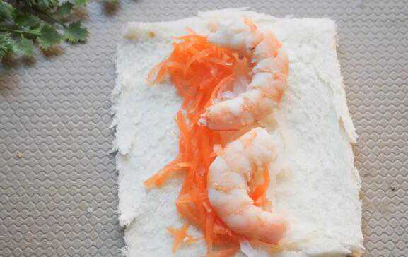 食材:鲜虾30克,胡萝卜10克,土司片1片,海苔片1片
