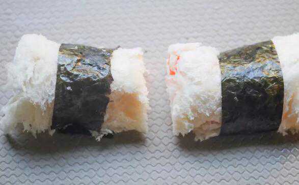 13.将准备好的海苔片,把吐司卷缠绕一圈,边边的地方也可以用少许水来粘粘。