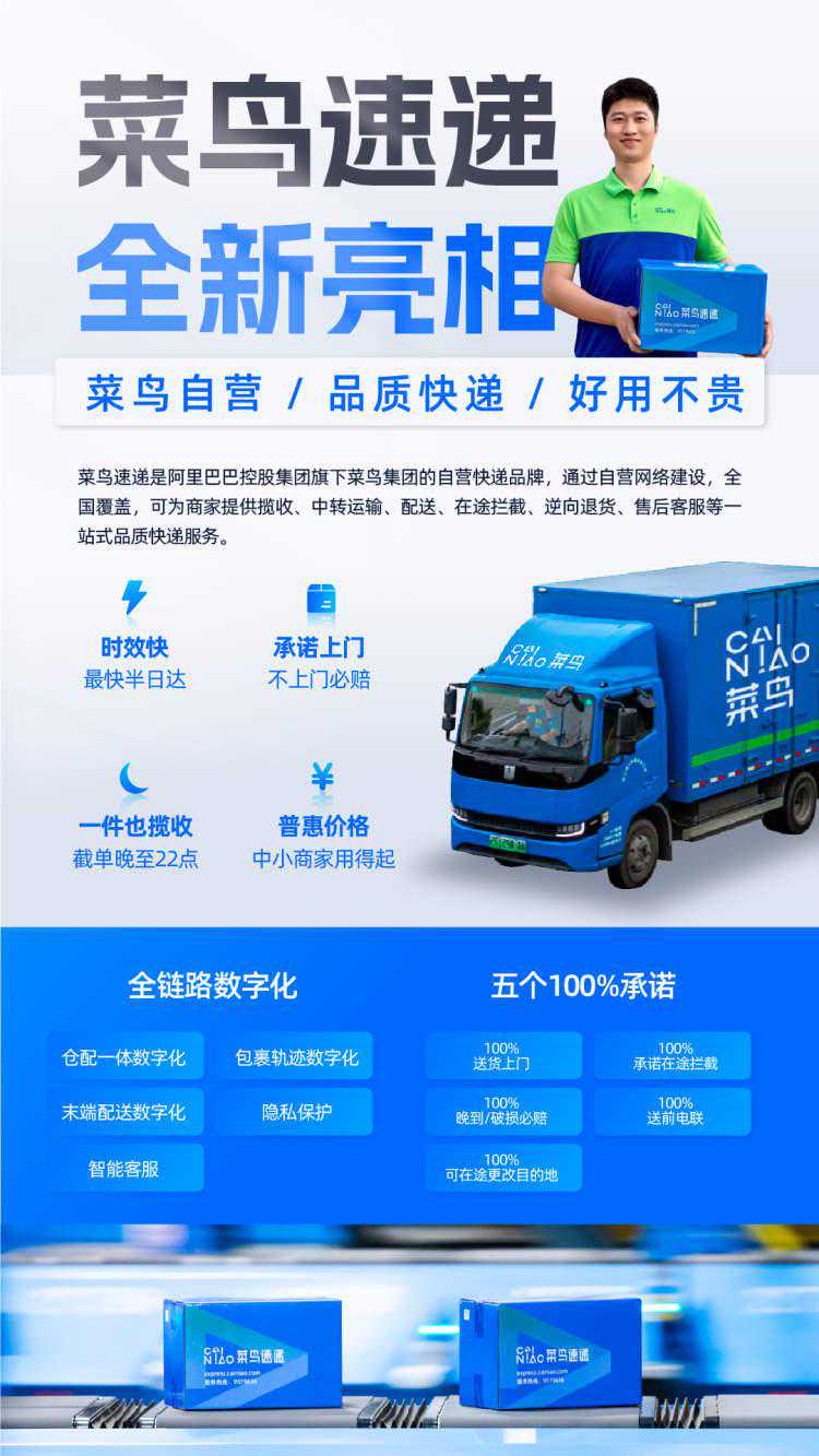菜鸟速递历经六年打造,由服务天猫超市的配送业务升级为全国快递网络,主打半日达、当次日达、送货上门和夜间揽收等品质服务,在全国近三百城提供晚到、破损必赔,不上门必赔,在途拦截和在途更改目的地等五个100%承诺。