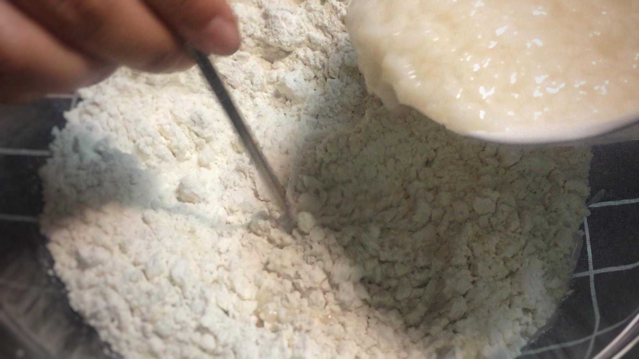 1.和面:在碗中加入面粉、酵母,分次加入250毫升的醪糟,边加边搅拌,搅拌成絮状以后下手揉成光滑的面团。