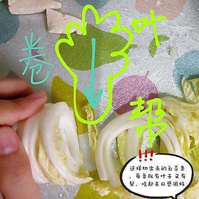 2、白菜叶从上往下卷起来,卷成一个圆柱体,然后切成细细的丝。这样一整条白菜既有叶子又有菜帮,吃起来口感会很好。