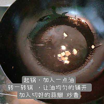 4、起锅,加入一点油。因为是一个人吃,所以少加一点举着锅,让锅里的油转一圈,均匀铺开加入切好的蒜瓣儿(蒜片蒜末都可以)炒香火不要太大,会糊
