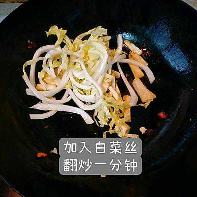6、加入白菜丝翻炒一分钟(半分钟也行都行)