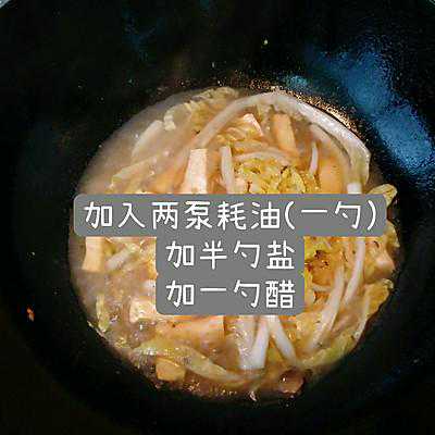 8、我家耗油是用了泵头的(很好用),加了两泵。差不多是一勺,再加半勺盐和一勺醋。可以随时用勺子尝一尝汤,甜了就加盐,咸了就加水,爱吃醋的多加醋。
