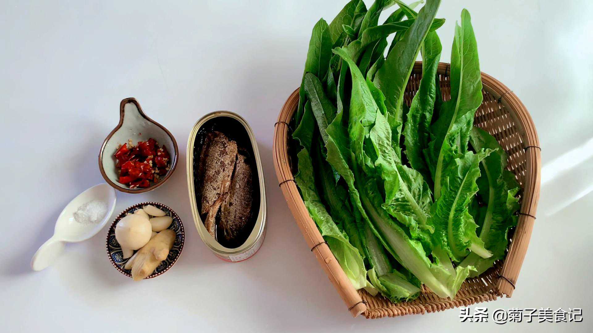 油麦菜300g/鲮鱼罐头200g/干辣椒段适量/姜10g/蒜10g/食盐适量