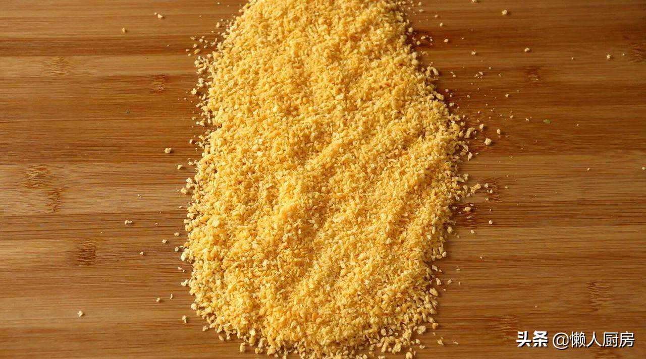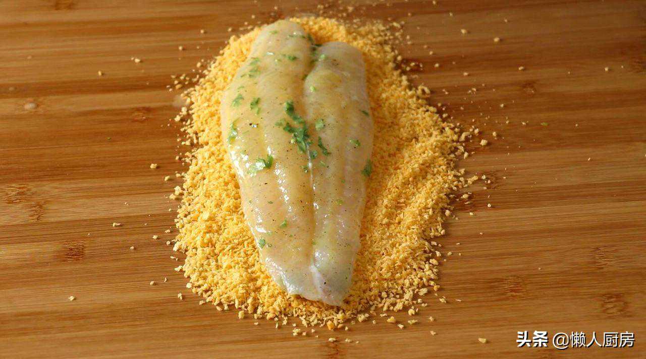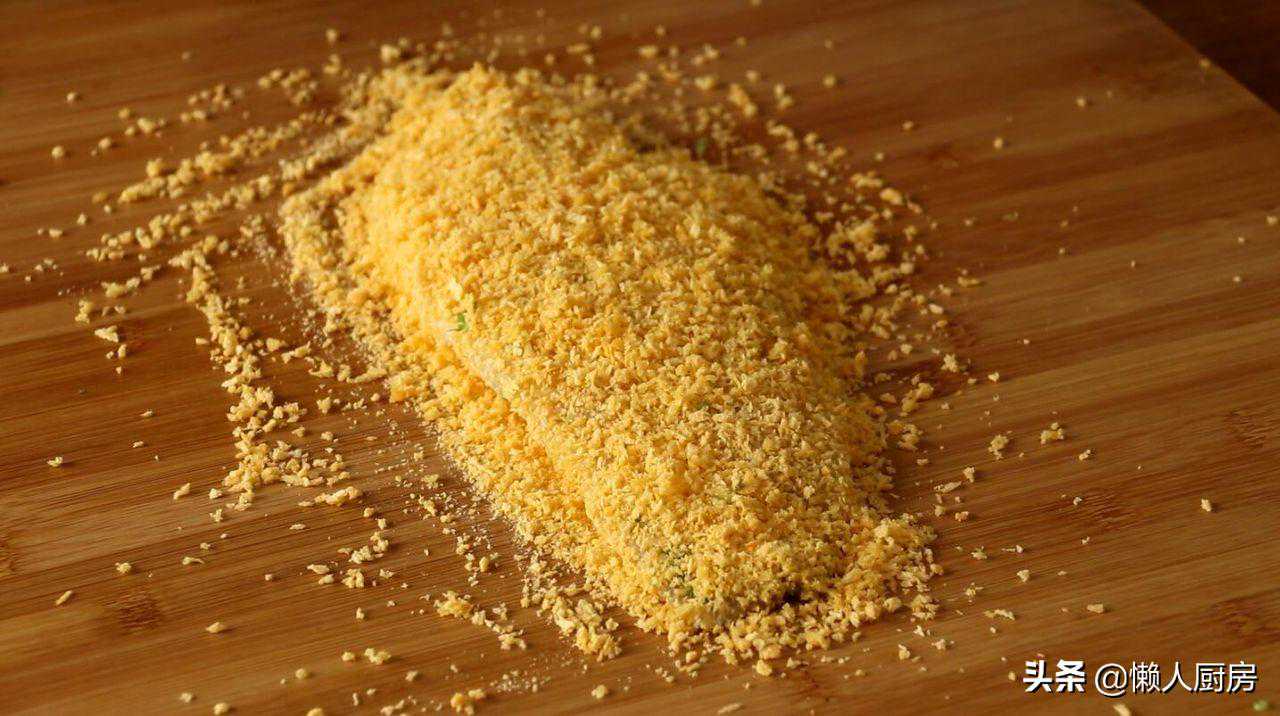 将面包糠撒在案板上,放入腌制好的鱼肉,两面都均匀地裹上一层面包糠。