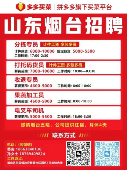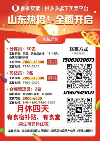 民以食为天。千门万户的一日三餐,与百姓民生紧密关联。随着近日新一轮寒潮来袭,线上消费需求攀升,足不出户买菜成为了广大市民的选择。为保障产运销等环节有序运转,做好市民粮食蔬菜供应,多多买菜青岛仓、烟台仓、临沂仓及周边地区现需分拣员、码货员、收退专员、果蔬加工员、仓库管理员、电叉车司机、销售BD等百余人。公司提供极具竞争力的薪资,部分岗位计件月薪突破万元,还有食宿补贴、住宿等福利。大平台有保障,薪资不拖欠、工作氛围佳。