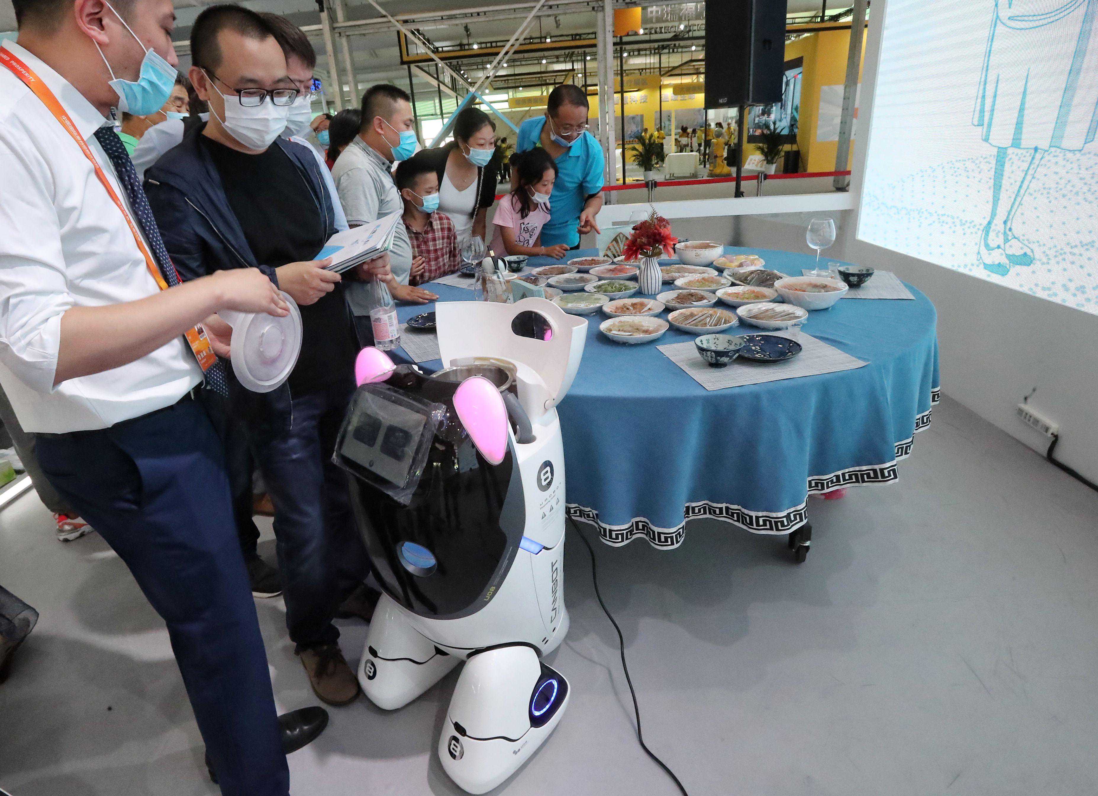 新京报快讯(记者黄哲程)今天(9月5日),2020年中国国际服务贸易交易会(简称“服贸会”)正式面向公众开放。在服贸会服务机器人板块展区的一个角落,一张大圆桌上摆放了黄焖鸡、油爆虾、炒花生等20多道菜,这些菜品全部出自现场一个炒菜机器人之手。