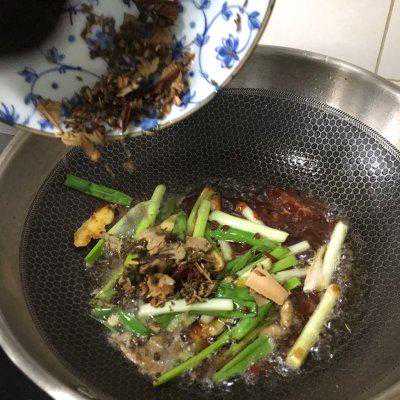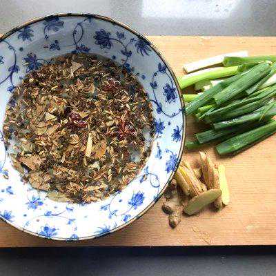 4、准备:葱3、5根、姜2大块。香料:桂皮1片、八角3只、香叶5片、小茴香一小勺凉水泡上去尘。