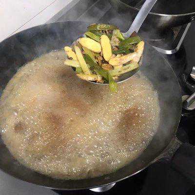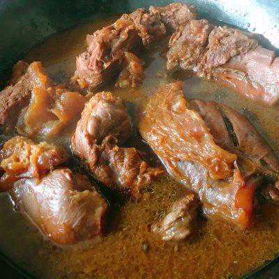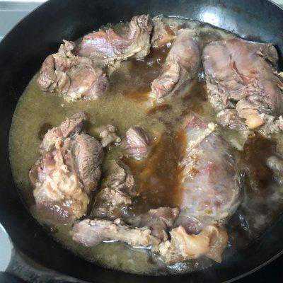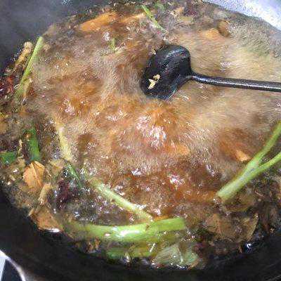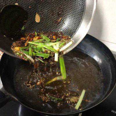 12、把炒制好的香料倒入旁边煮牛肉的水中