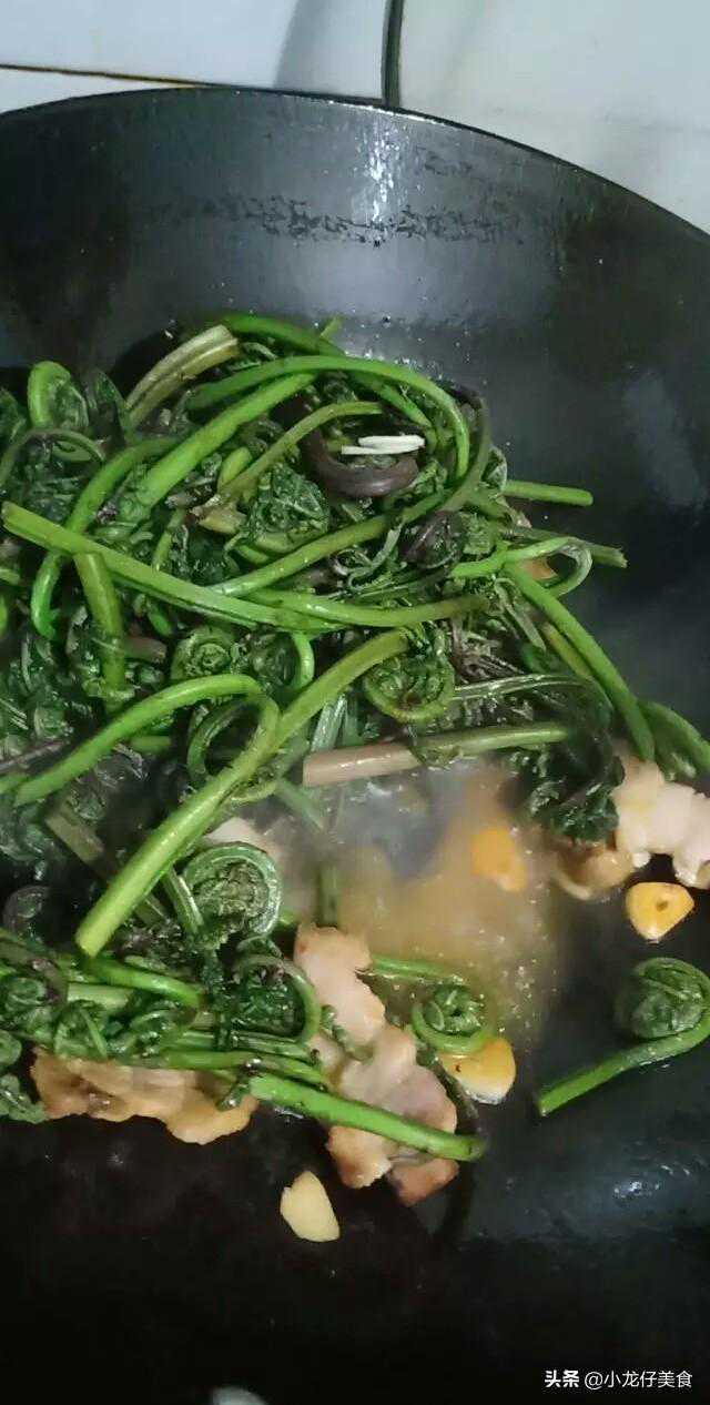 3.山野菜事先打个水焯,大概三分钟后捞出,这时将已经焯好的山野菜倒入锅内,迅速的翻炒。加入一勺生抽,适量的盐,蚝油一勺,十三香和适量的鸡精,翻炒均匀即可。