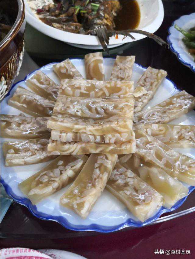 1、1斤猪肉皮煮5分钟取出,刮净内测油脂,再用盐和醋搓洗干净。