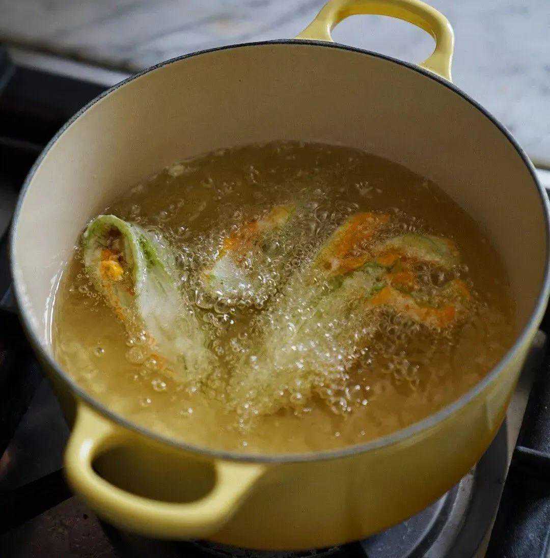 (4)热锅上油,待油五成热时,放入裹上面糊的南瓜花炸至金黄,捞出装盘,酥脆香糯的炸南瓜花就做好了。