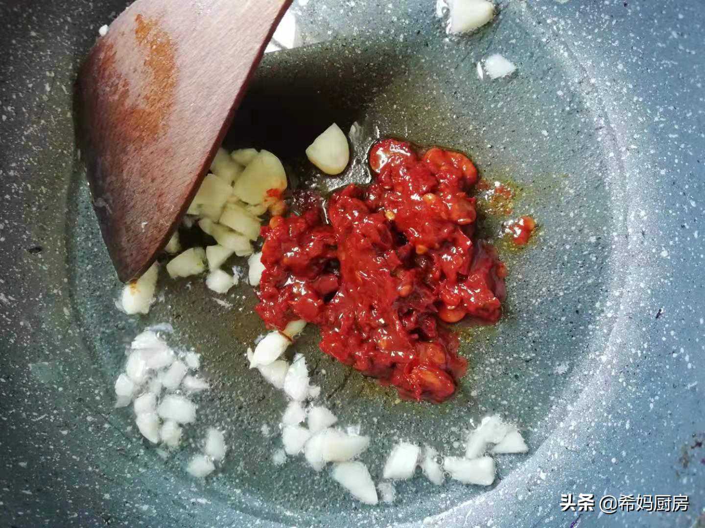 锅中放一点点食用油,下入蒜末炒香,然后放入两勺豆瓣酱,把红油炒出来。