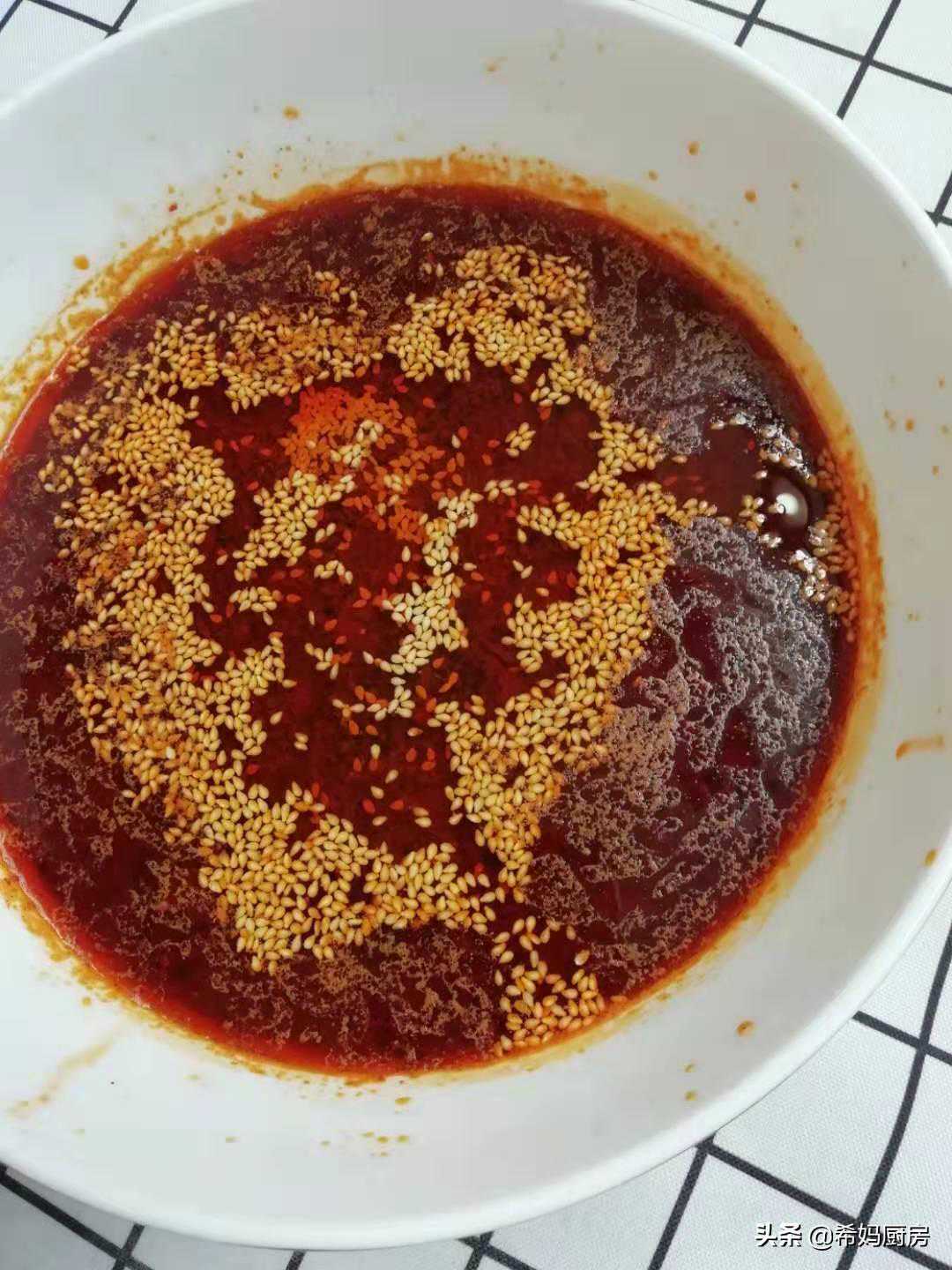 然后加点白糖进去,接着,准备一个大一点、深一点的容器,把汤汁倒进去,然后在里面撒一把熟芝麻,如果没有熟芝麻,可以放进烤箱烤一会或者用食用油爆香都可以。