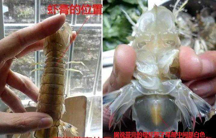 辨别公母:母虾腹部靠近头颈的位置有三条乳白色的横线,透过灯光可以看见母虾背部中间有一条明显的实线,这是红红的虾子映衬出来的颜色~而公虾通体一种颜色。
