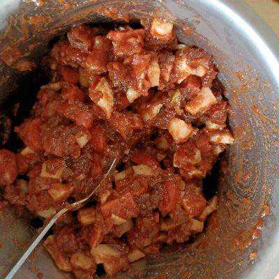 8、将卤肉切成指甲盖大小拌入白酒,最后和叉烧酱拌在一起即可,叉烧馅就准备好了。