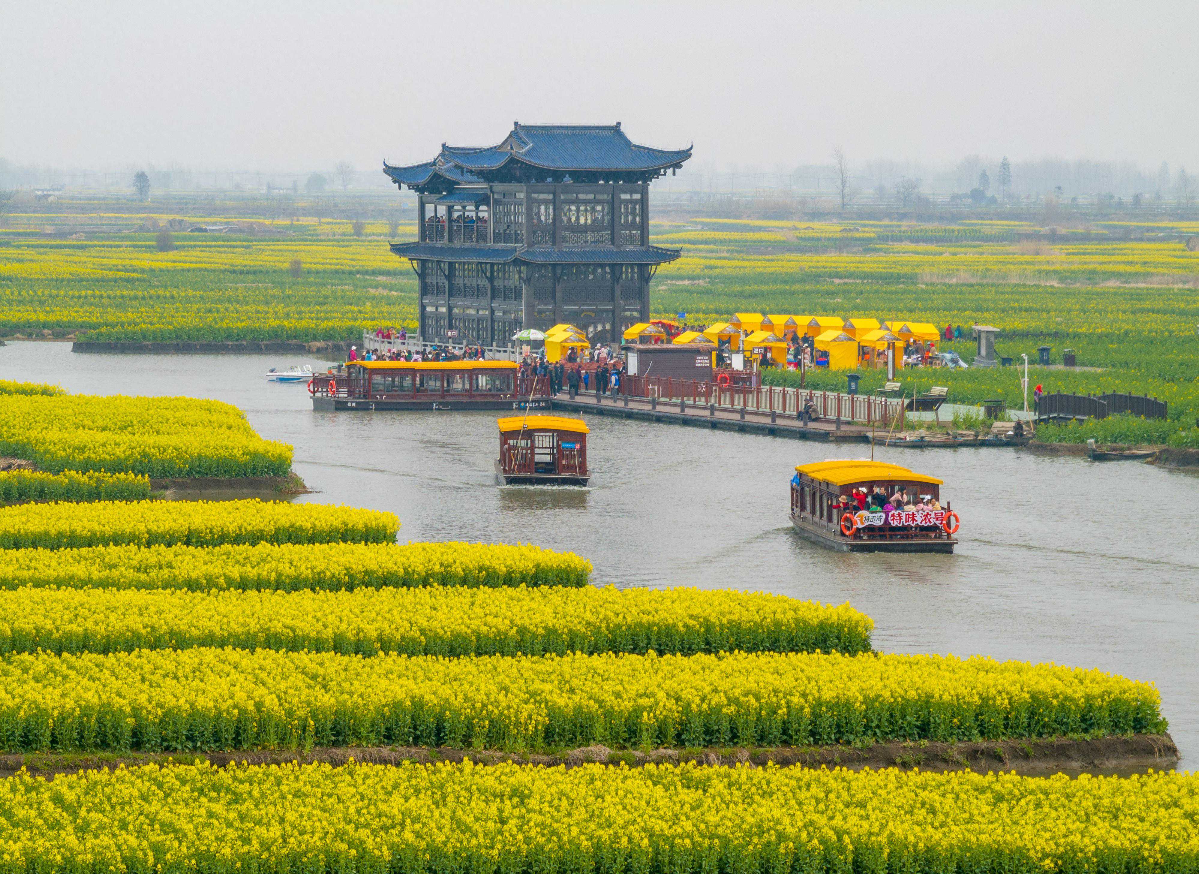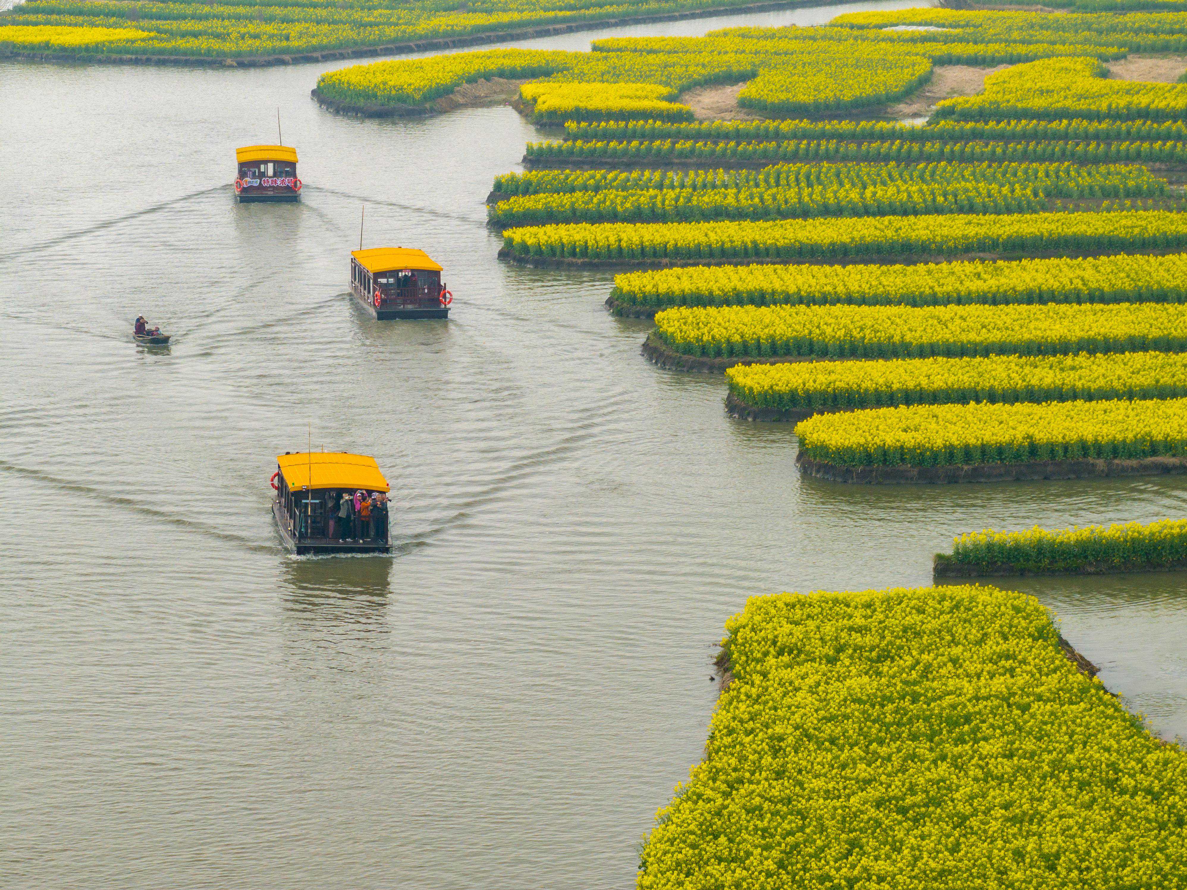 ↑2024年3月26日,游客在江苏省兴化市千垛景区乘船游览。(无人机照片)CICPHOTO/周社根摄