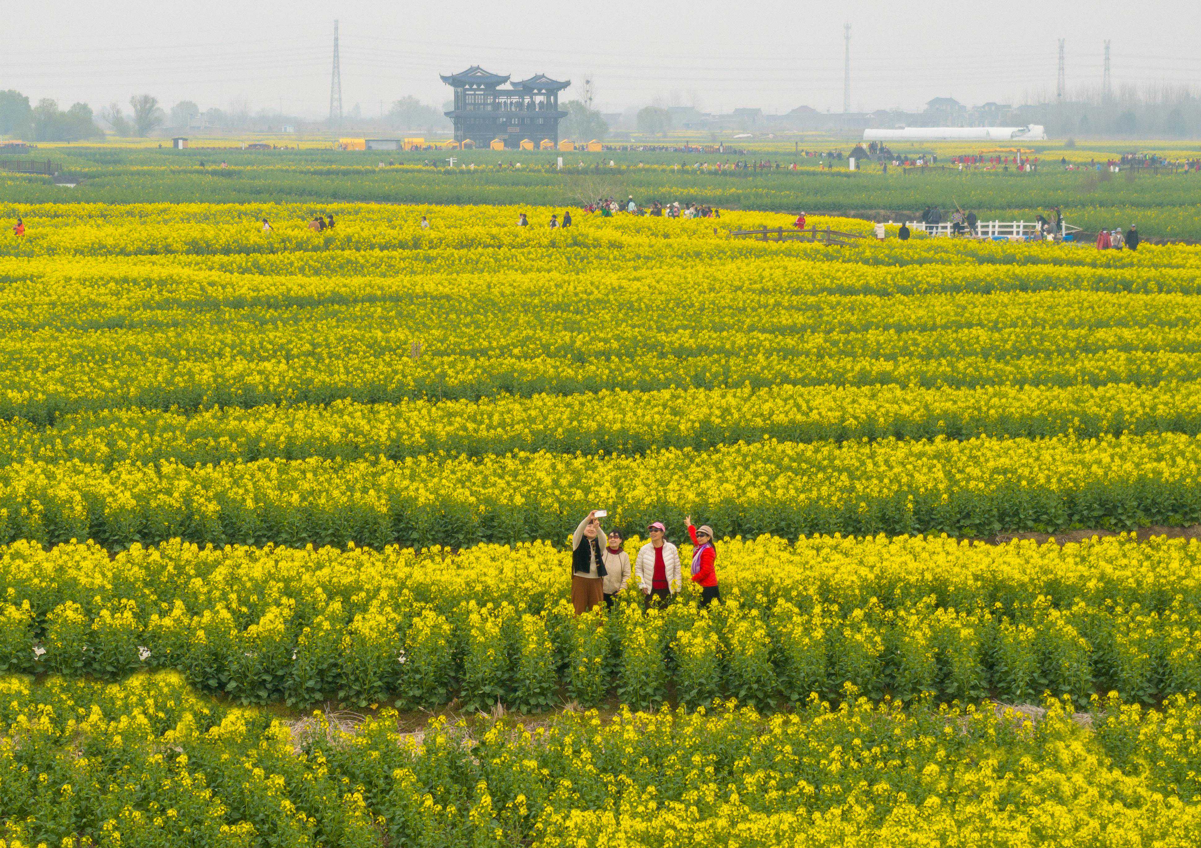 ↑2024年3月26日,游客在江苏省兴化市千垛景区游玩。(无人机照片)CICPHOTO/周社根摄