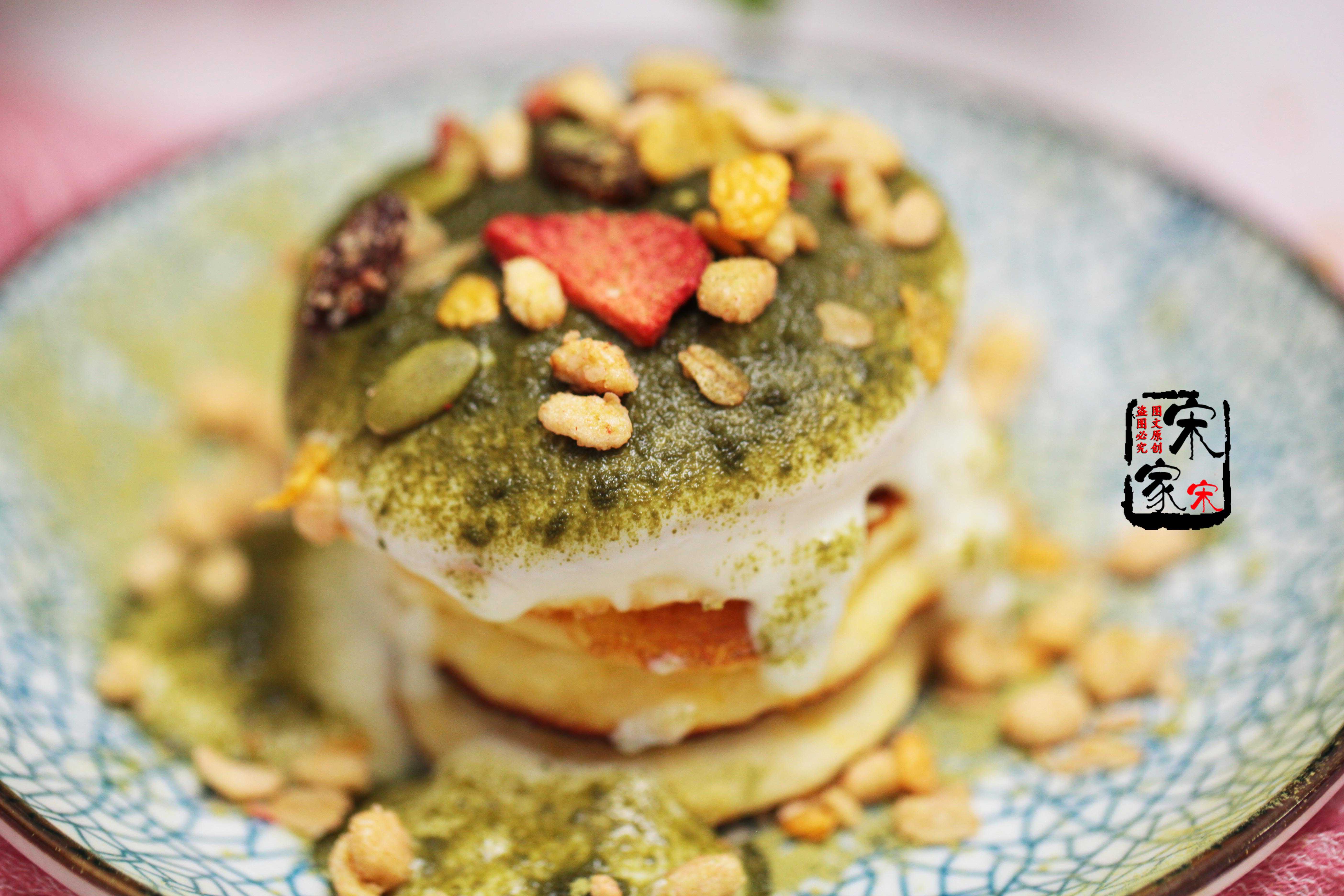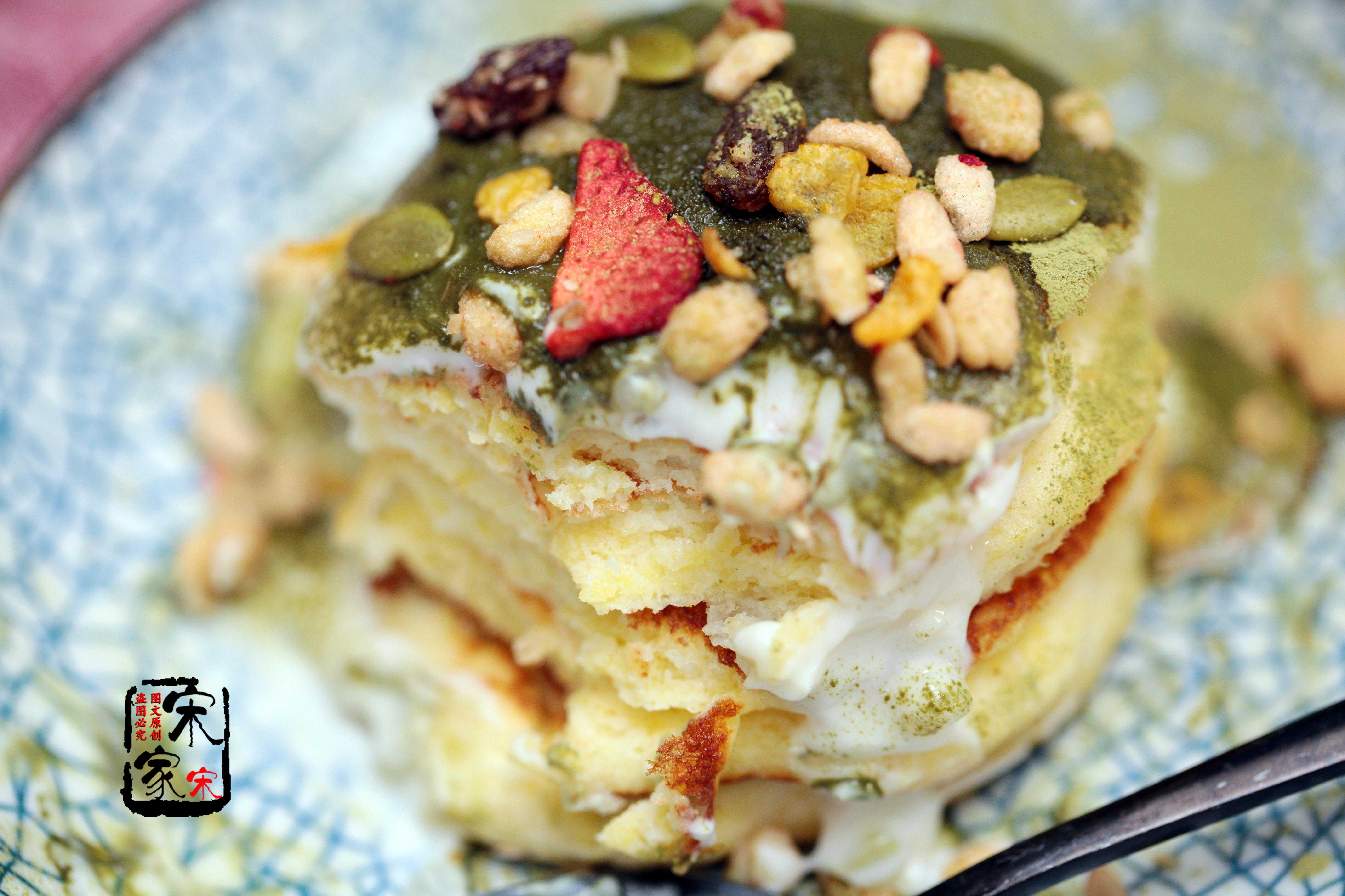 第七步:把煎好的小蛋糕摞在一起,可以直接食用,也可以浇上酸奶,撒适量抹茶粉和燕麦片食用。