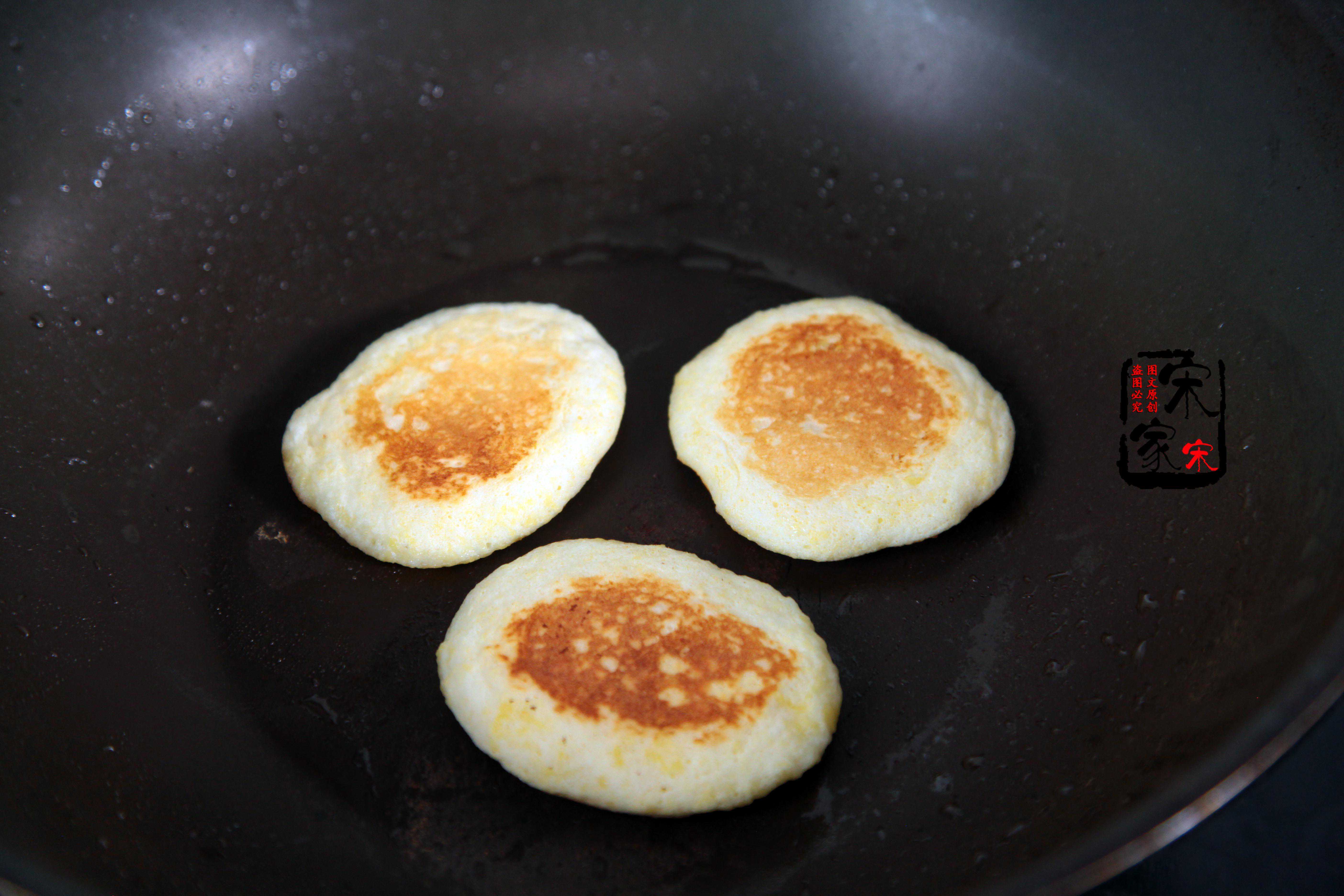 第六步:平底锅小火烧热,不放油,舀1勺蛋糕液进去,慢慢定型,庵后放一点点水进去,盖上盖子小火煎到两面金黄,中间不流心就可以了。