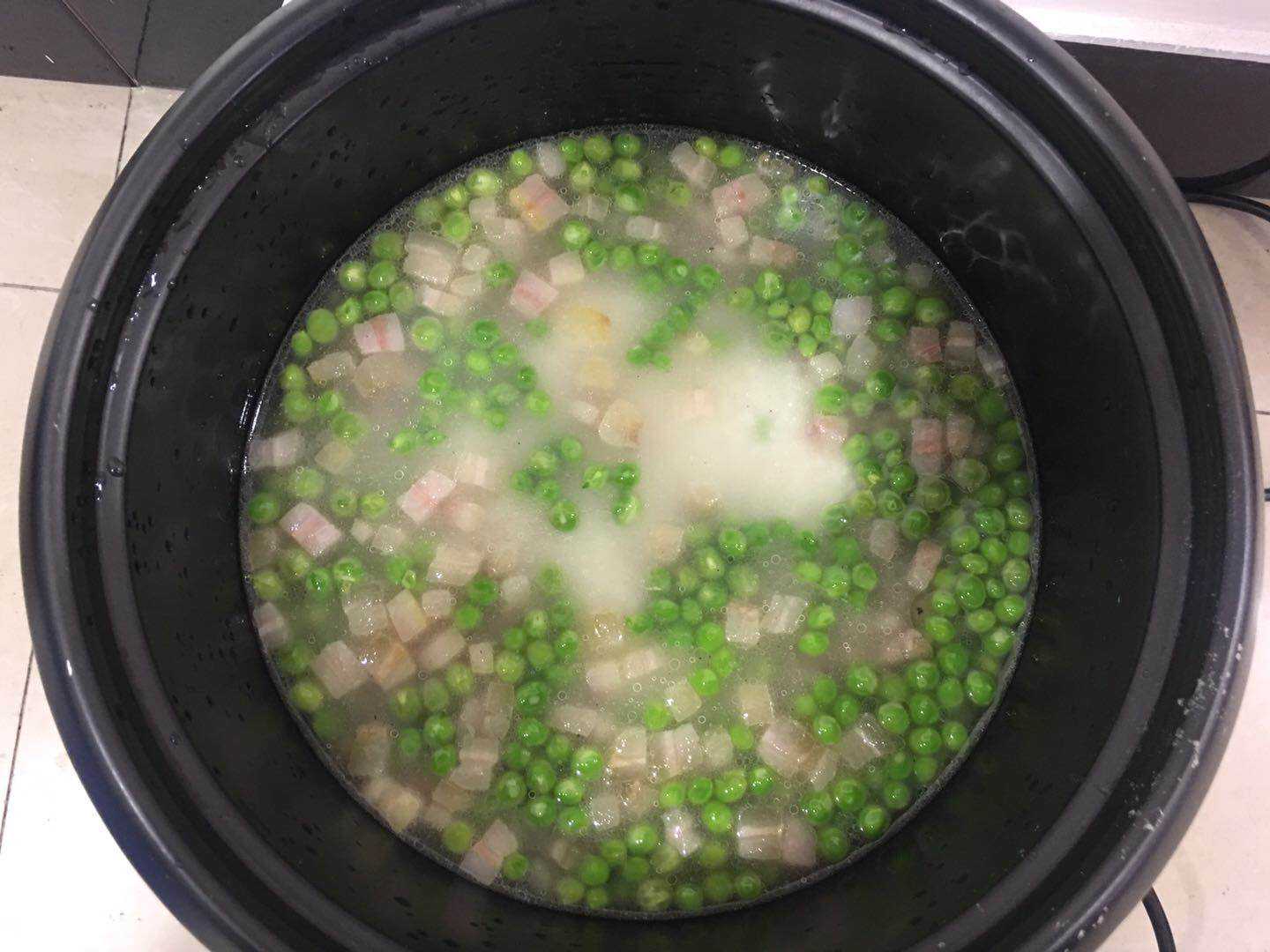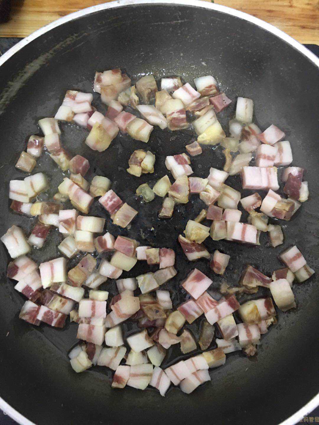 2、起油锅,下咸肉丁煸炒出香味,倒入豌豆,加入一点点料酒翻炒1分钟;