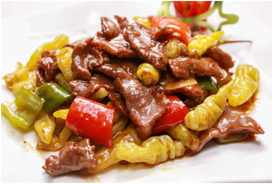 3、热锅注油,倒入腌好的牛肉片,滑油至断生捞出。