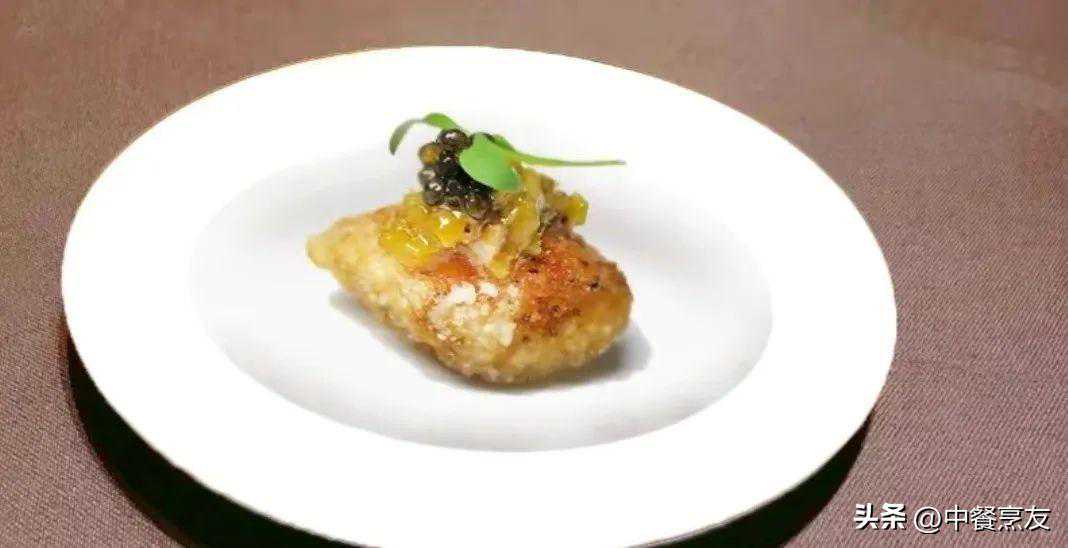 元贝裹上调好的糊后下入油锅中炸至表面金黄酥脆,捞出控油摆盘,舀上一勺青椒蒜酱放在上面,再用鱼子酱点缀即可。