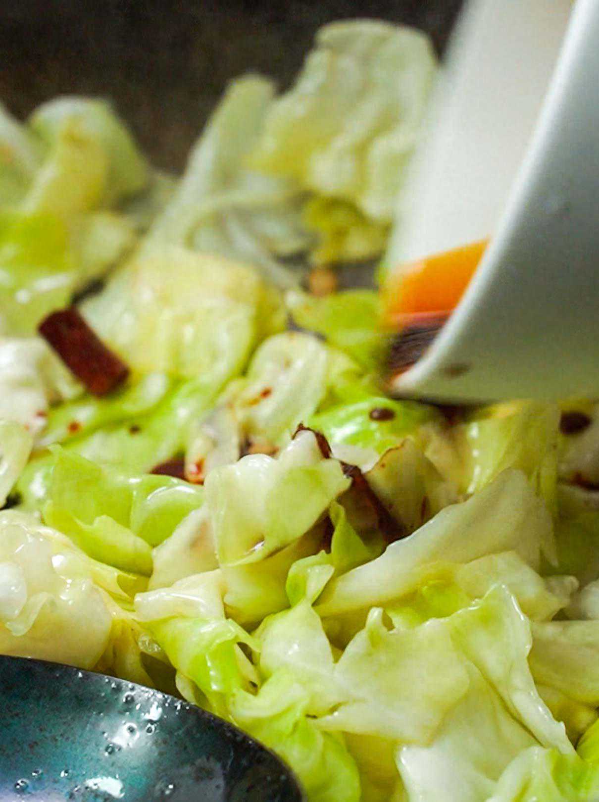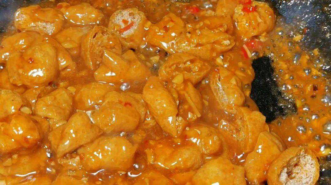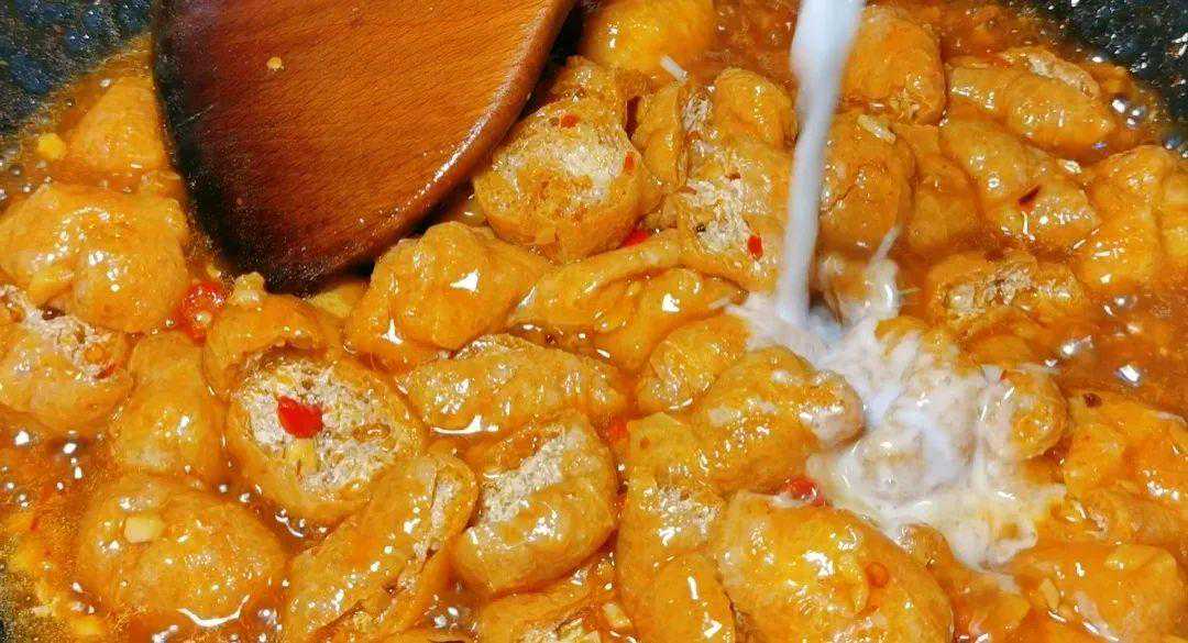 4.大概煮2到3分钟,油面筋充分吸收汤汁后,倒入事先调好的生粉水,翻炒均匀。
