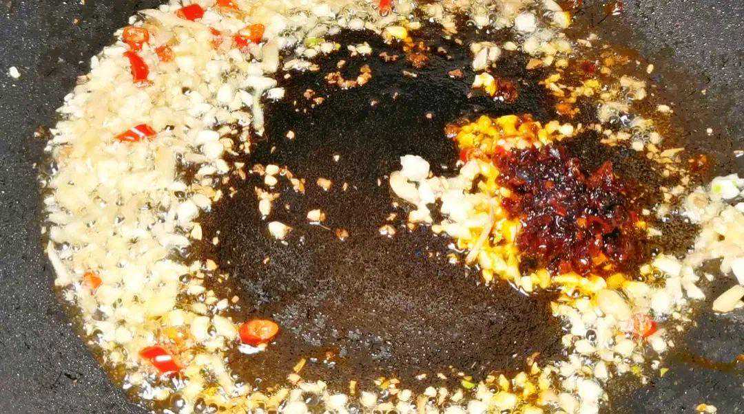 2.锅内烧油油热放入姜蒜,小米椒爆香。放入一勺老干妈翻炒均匀。
