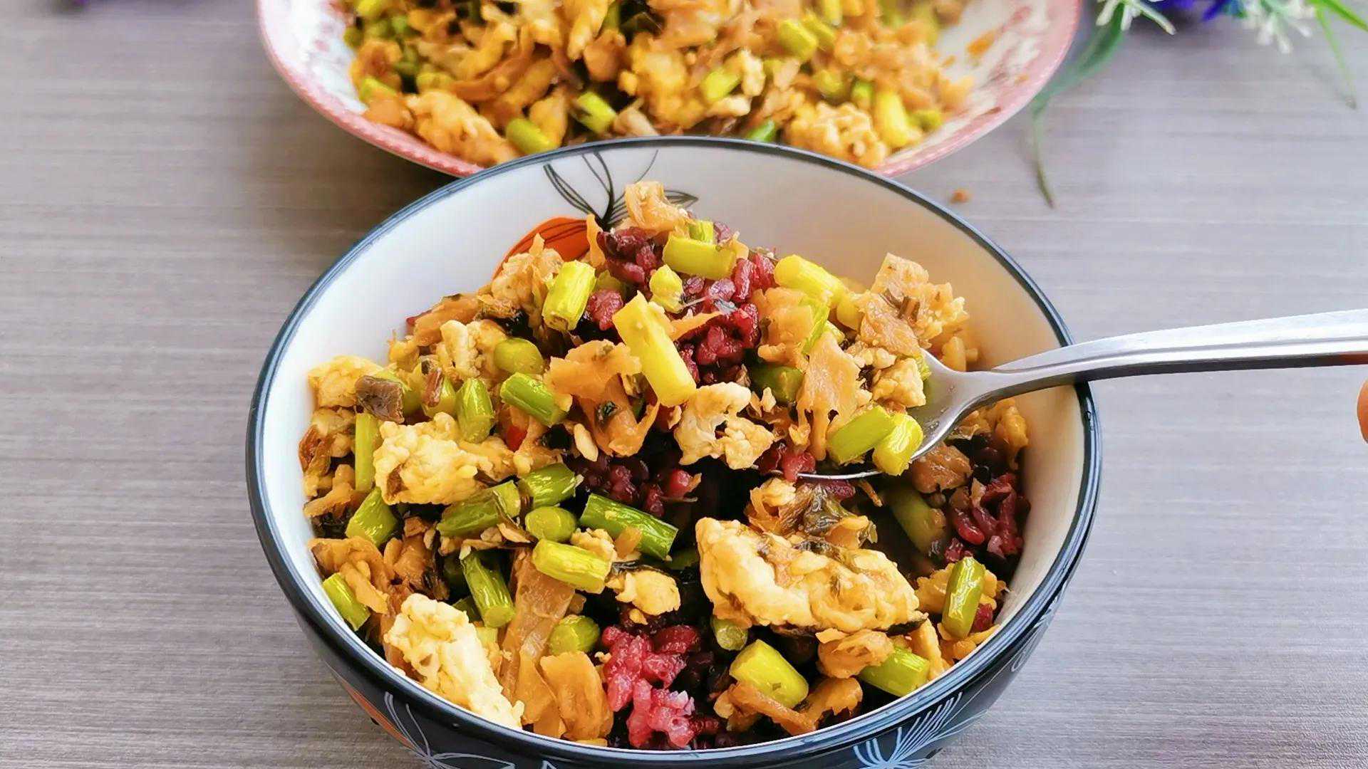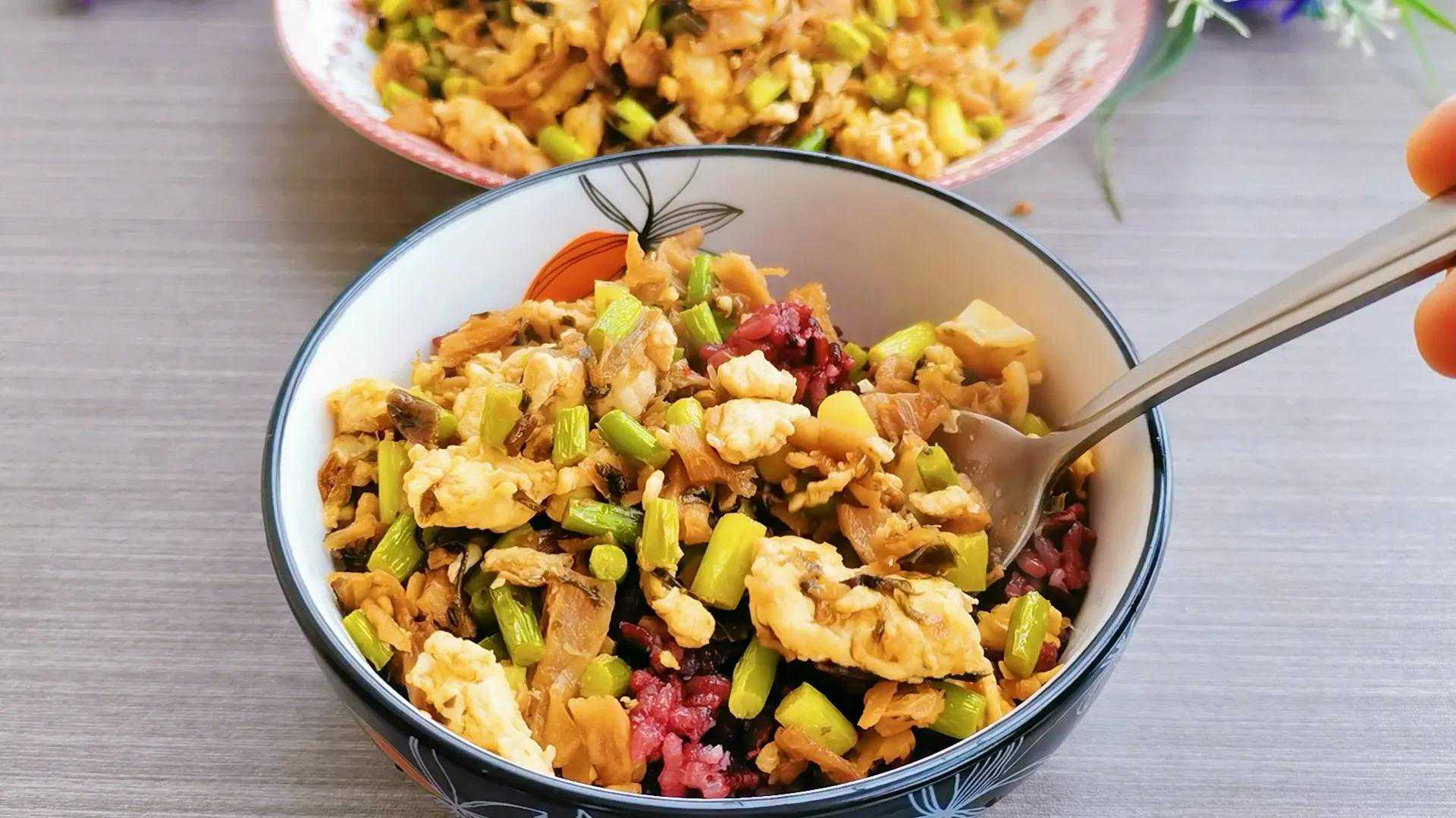 今天用外婆菜搭配蒜薹和鸡蛋给家人做道下饭菜,特别开胃,连我家小朋友都吃着特香。