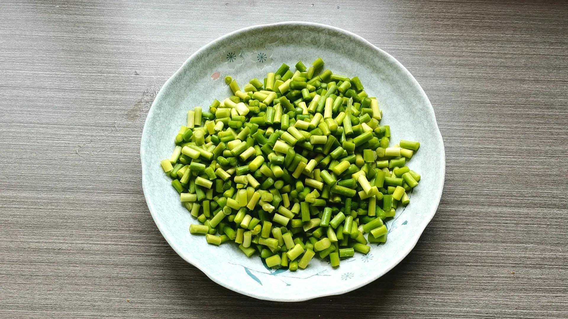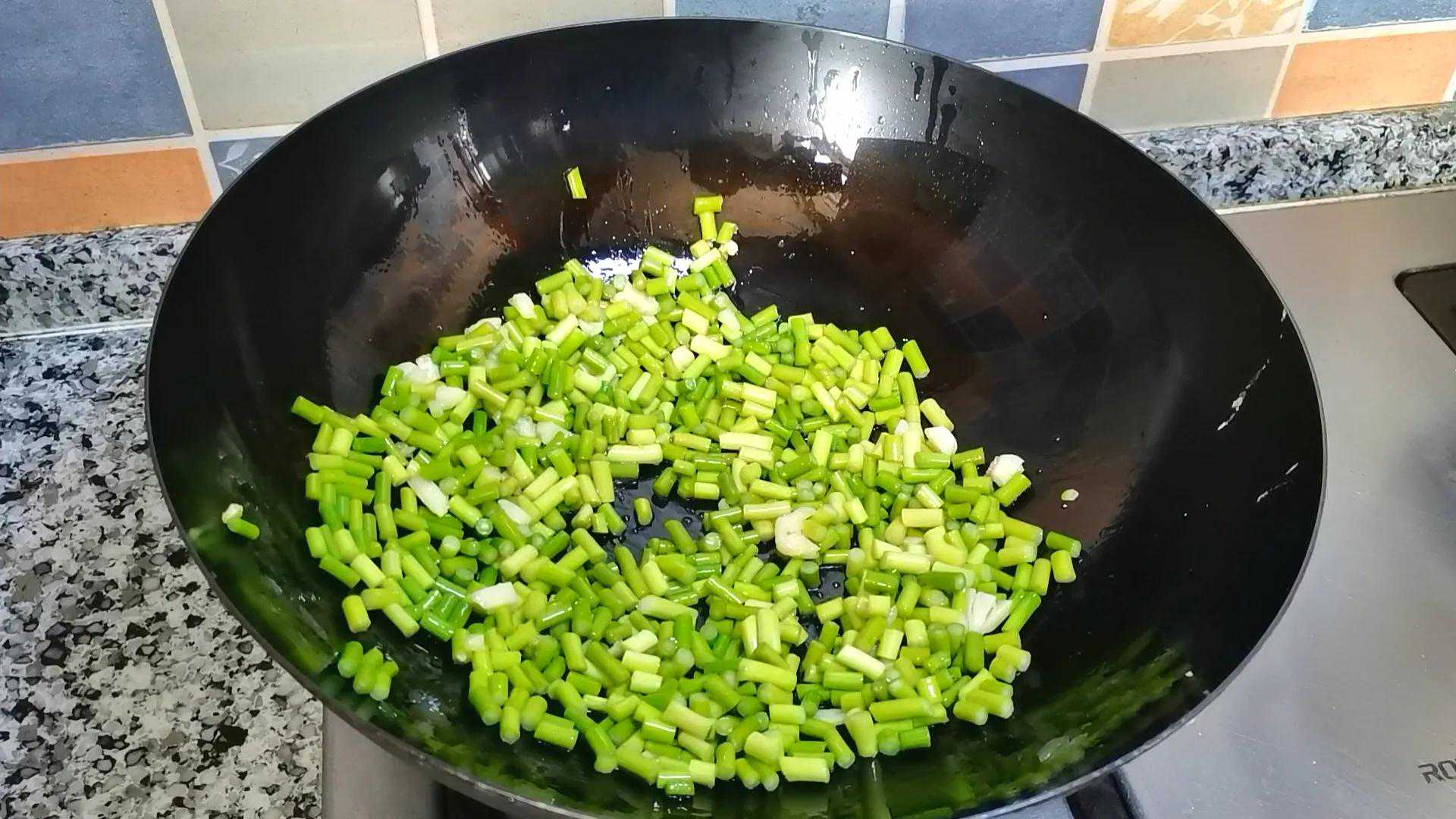 5,锅中加油,倒入蒜末炒香,倒入蒜薹,大火翻炒。加盐翻炒均匀,如果有点干,少量滋点水,翻炒入味。