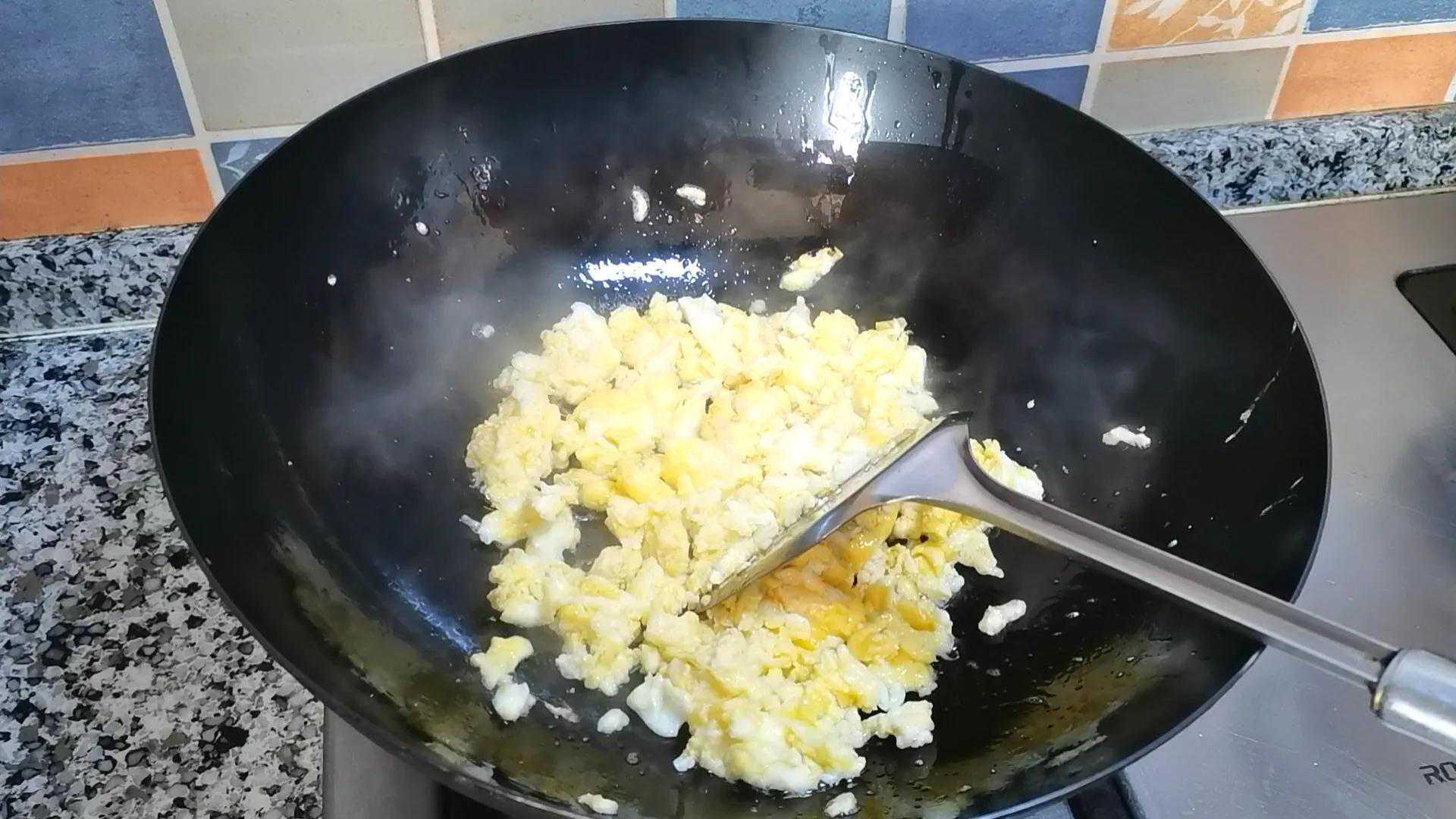 4,锅中加油,倒入鸡蛋,炒点鸡蛋碎,盛出来备用。